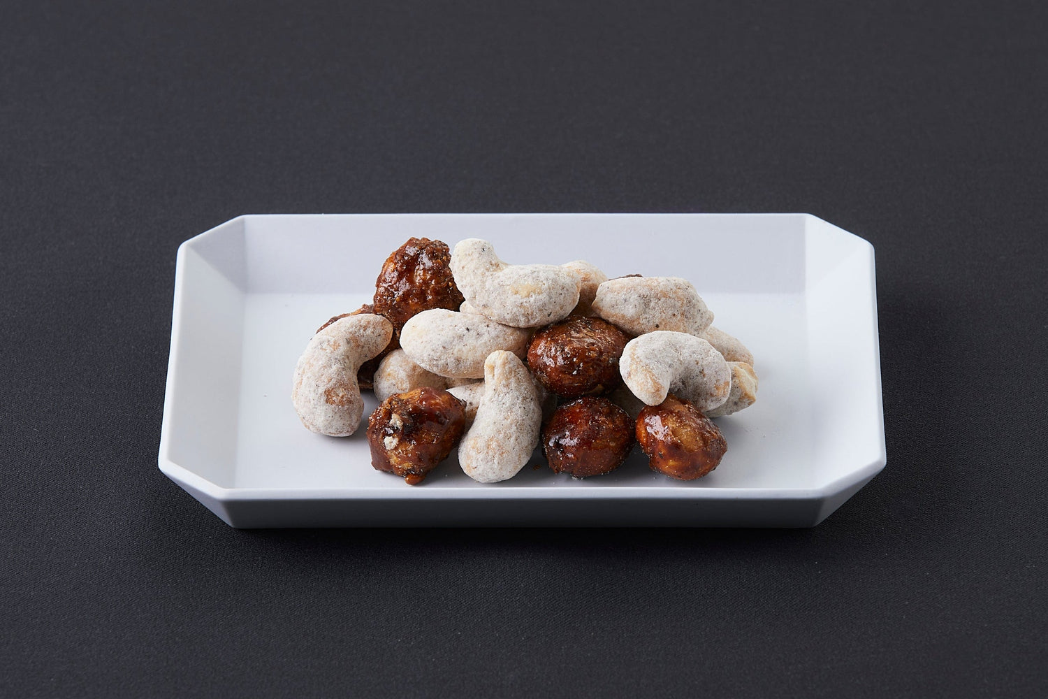 2種類のナッツ(カシューナッツとマカダミア)に塩気のあるバニラの糖衣をまとわせました。ちょっとしたおやつや、お酒のお供におすすめです。
